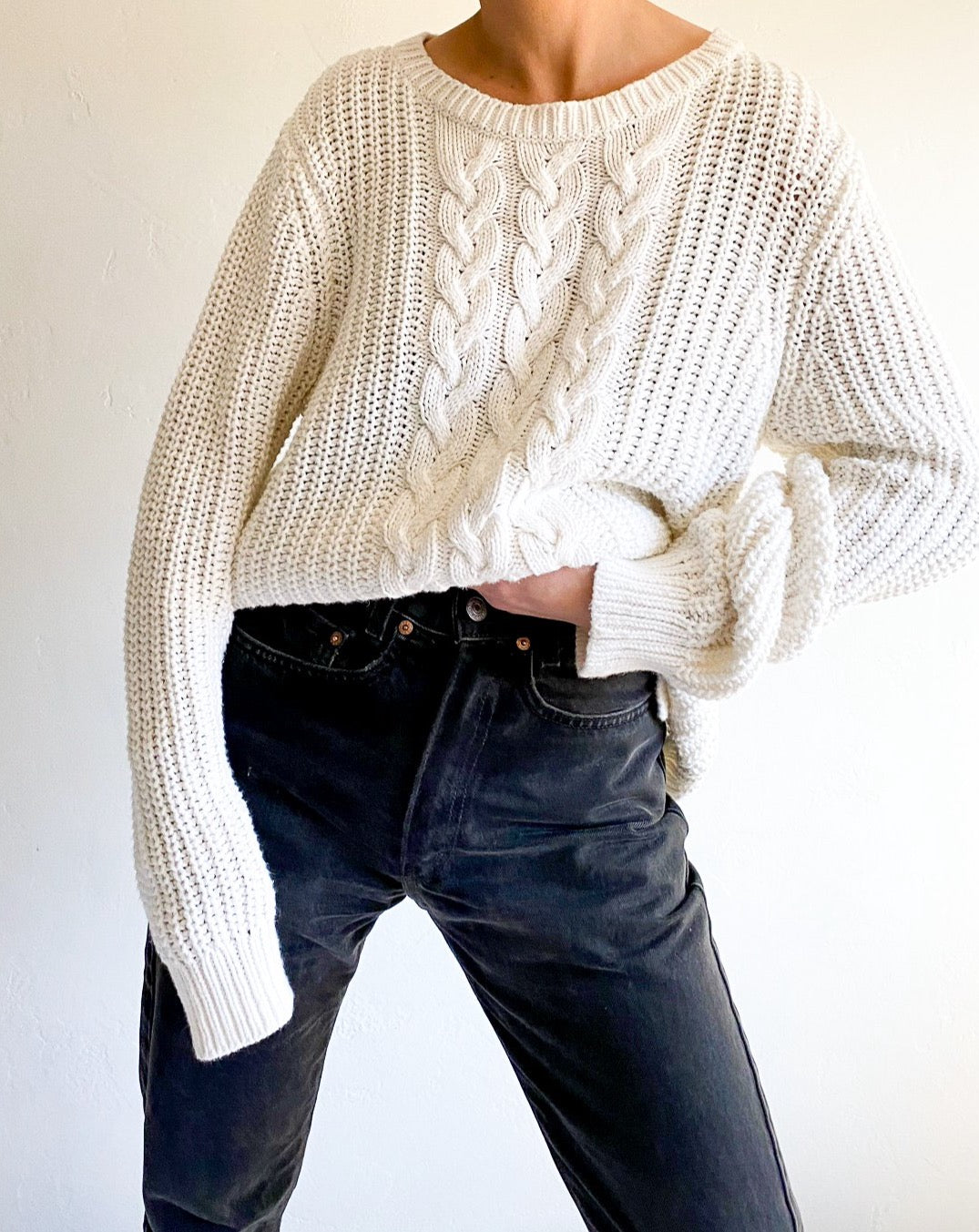 Vintage cotton blend men's cable knit sweater in eggshell white.