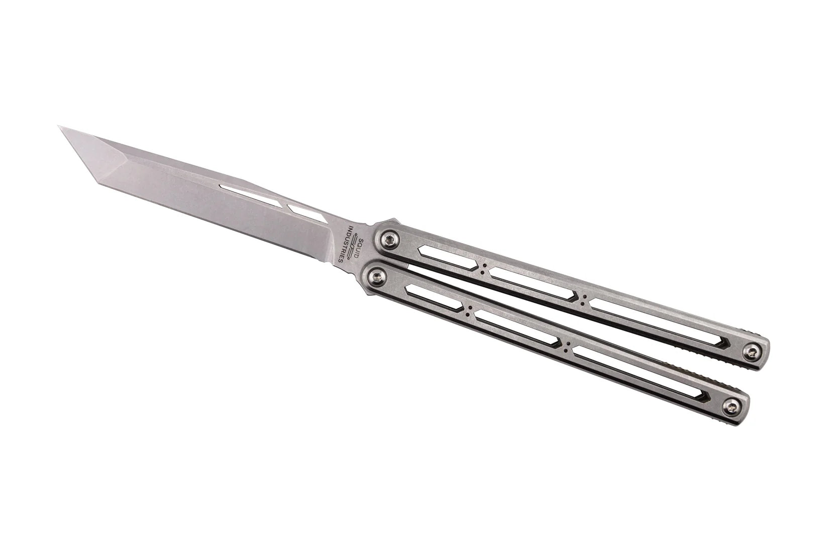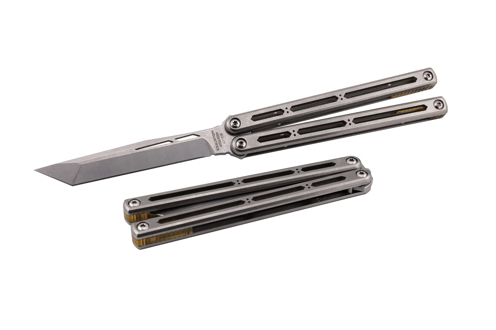 The Hydro is our first sandwich titanium balisong, and it’s also the first to feature our unique double-angle chamfer design. Most conventional balisongs made by competitors only provide a single 45-degree chamfer which often yields subpar comfort. The Hydro’s double angle chamfer is two distinct chamfers, one at 30 degrees and the other at 60 degrees, which creates a much more comfortable, controllable experience.